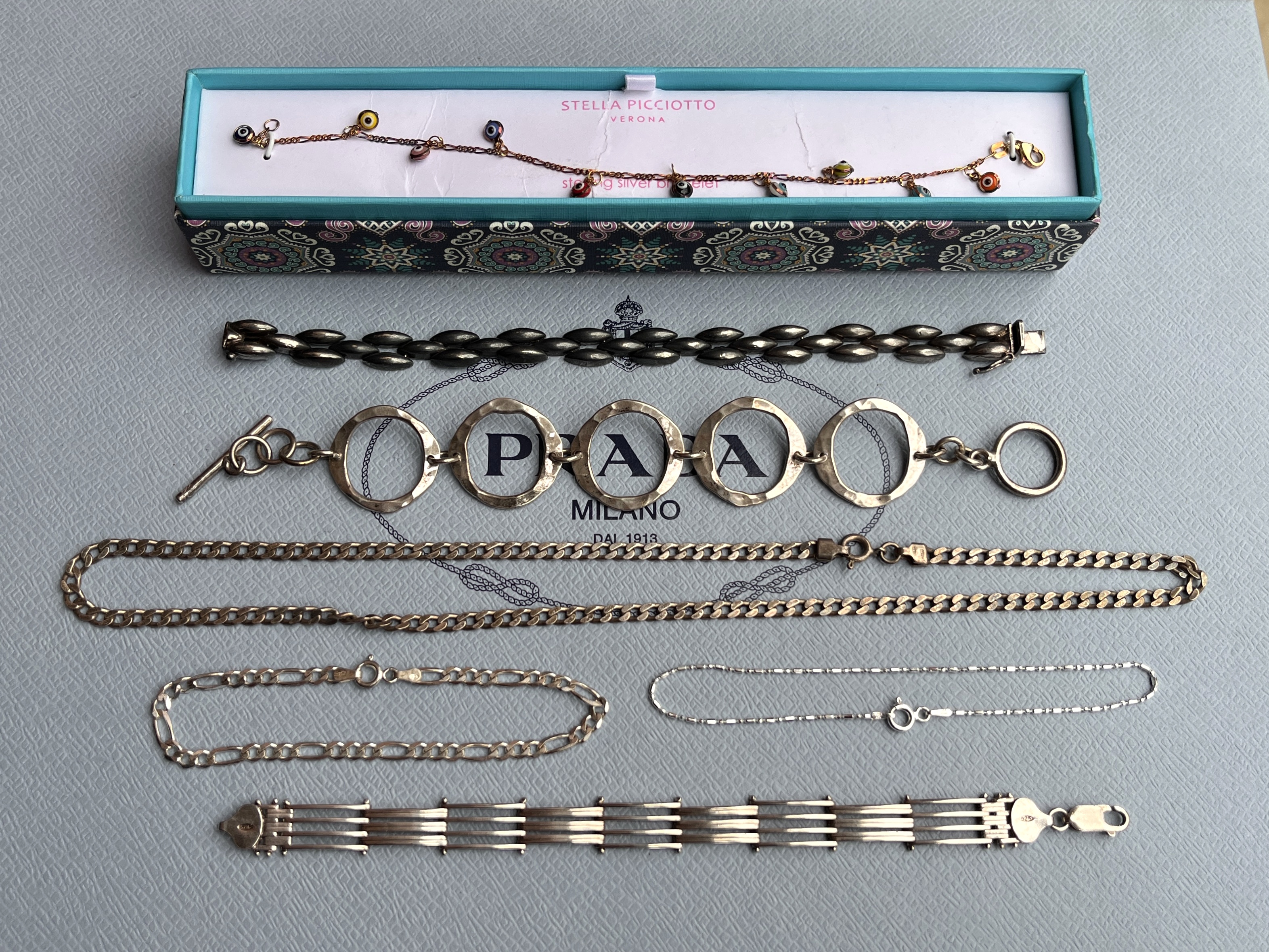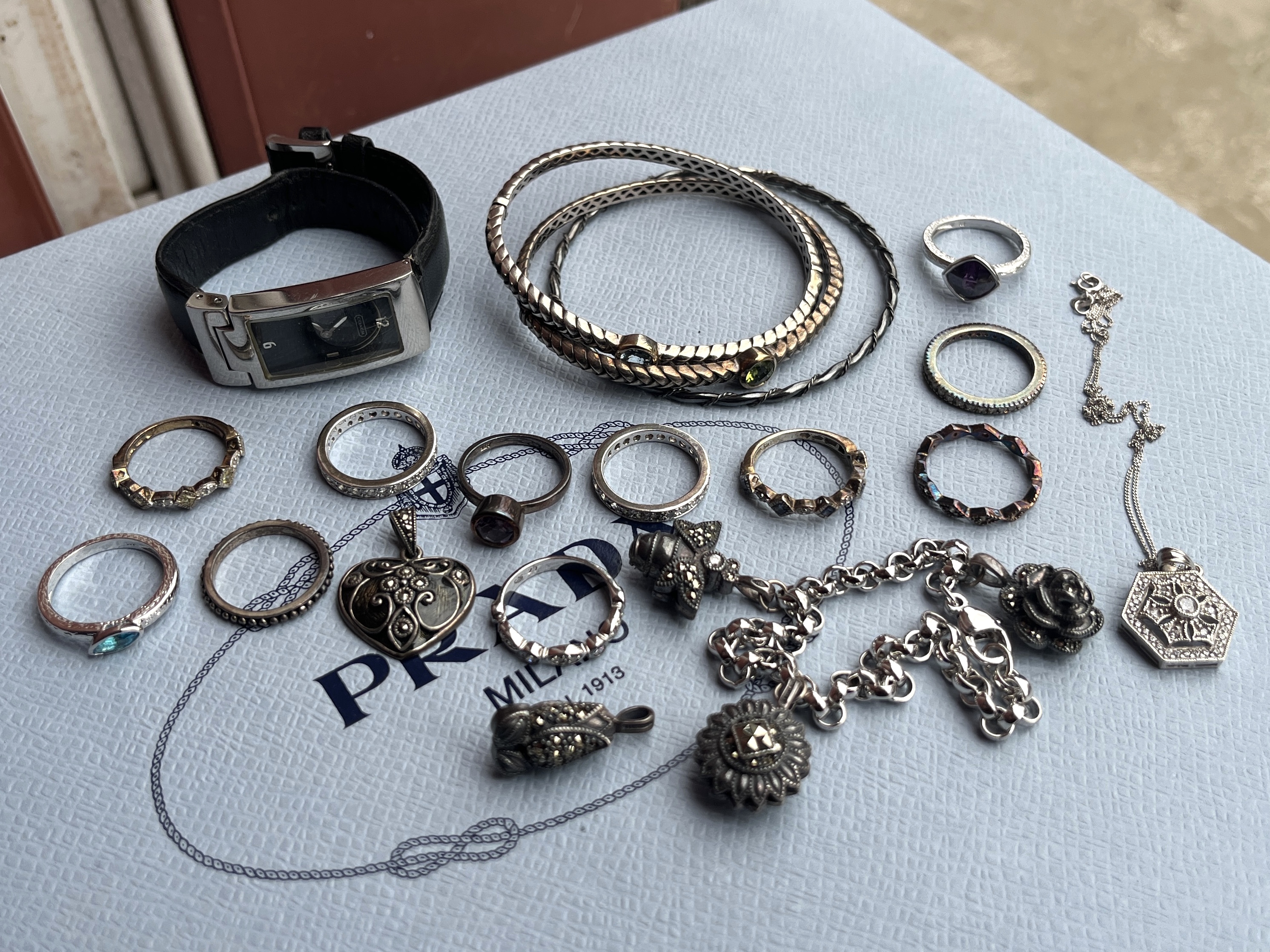 Here’s the jewelry finds from back when I mentioned having “one particularly good run each of the last two weeks” (December 5th post). This is all the silver, plus the charm chain which is marked 925 but appears to be not, a Coach watch, and the necklace/pendant on the right which is 14k white gold. My favorites from this batch are the charms, which are pretty hefty and feature marcasite stones, as well as the matching bracelets in the back. Those are marked as T&C – not Tiffany and Co, but Town and Country. They’re very pretty regardless and seem to sell for around 150$ each on eBay.