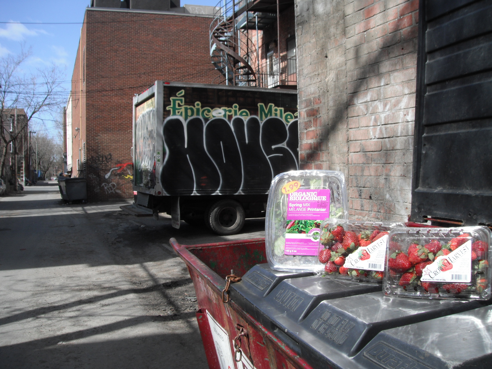 There are dumpsters for some grocers in the same alley, and I found some decent looking strawberries and some greens. This is the first time I actually found dumpster food here. I gave the greens and one strawberry box away, and kept one myself.