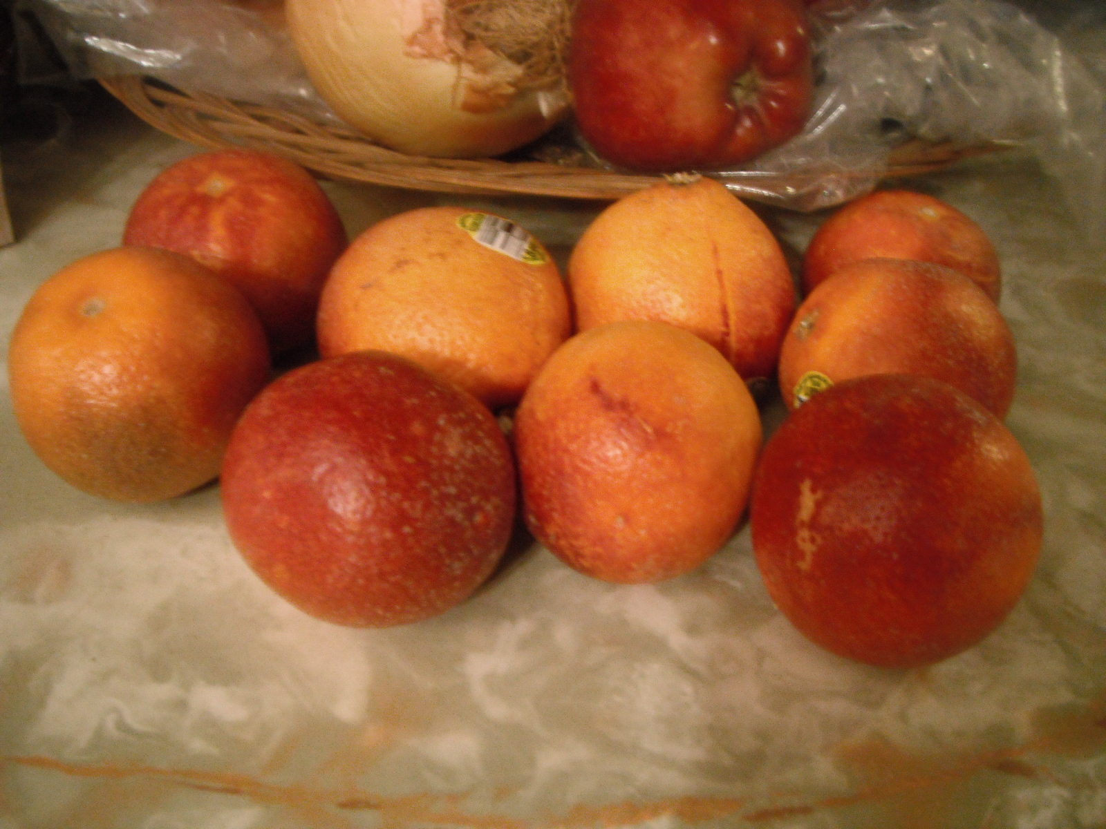 I got some little blood oranges out of the dumpster. A few of them were moldy, but I salvaged a bunch. There were a few more than seen in this picture, but I ate them. They taste pretty good, but they’re almost disconcertingly “bloody.”