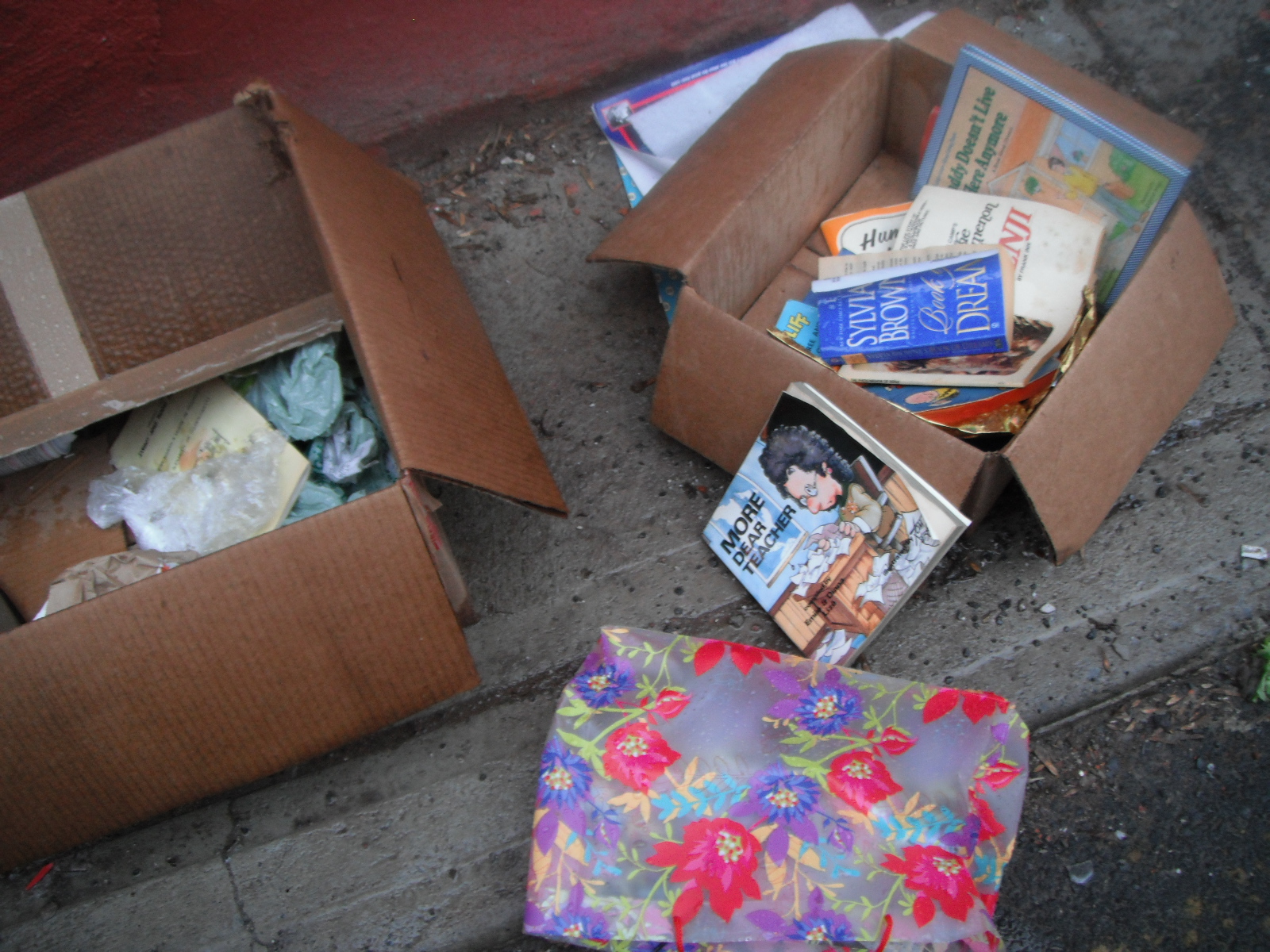 Here’s an odd box of things left out on a rainy day. It looks already scavenged through, and the rain more or less ruined the books. One book is titled: “Daddy doesn’t live here anymore.” Looks like a book to help kids through their parent’s divorce.