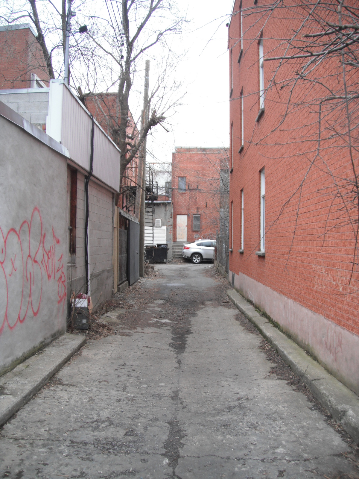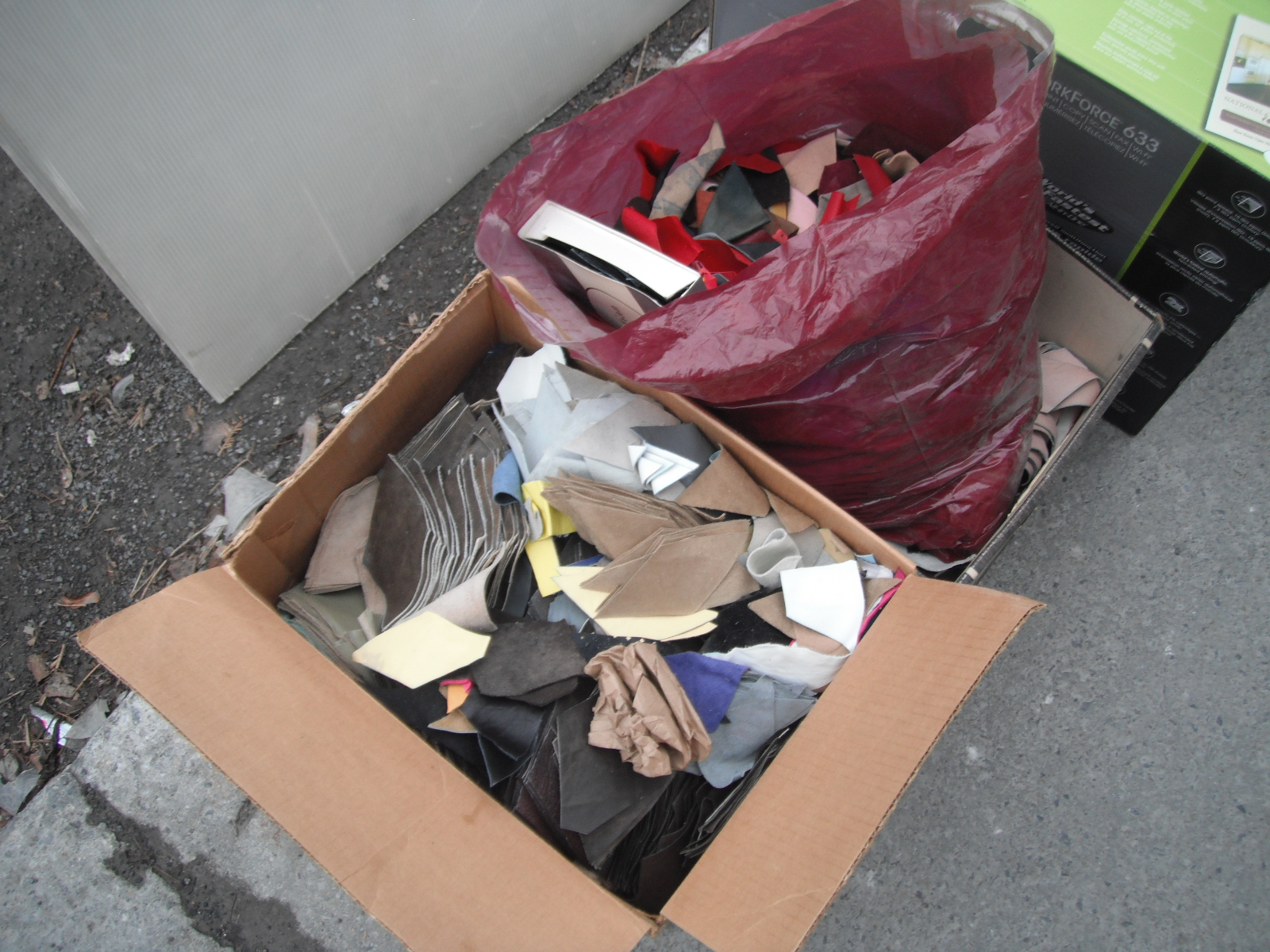 I found these leather cutouts on St Urbain between Fairmount and St Viateur. Most are were cut in a diamond pattern. Some of them were a bright crimson red, so now I can show proper solidarity with the student protests going on around here these days. I thought they could be used in a cool craft project, so I took the bunch and stashed them in an alley for later (picture below). They were pretty heavy, and I didn’t feel like stopping walking quite yet.