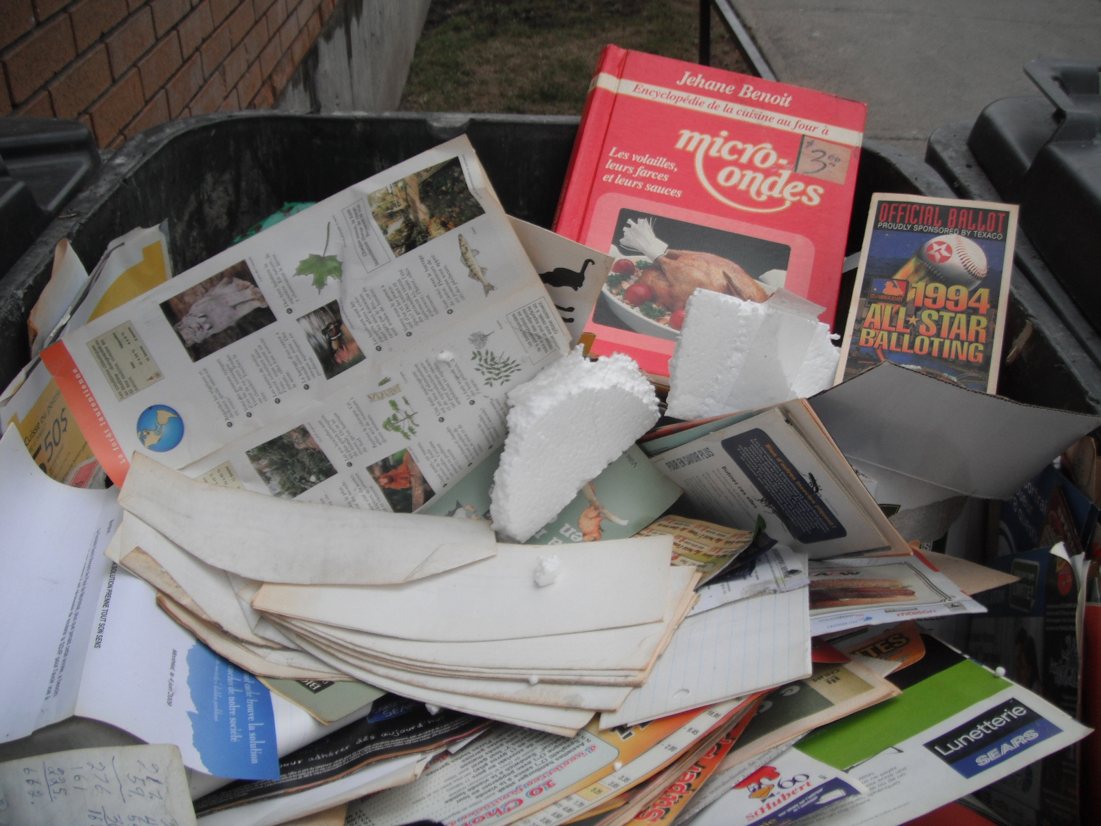 This bin contained some old-ish papers. Included is a microwave cooking book and a 1994 Major League Baseball All-Star ballot. 1994 is the year the Expos were actually doing really well, but then the players went on strike and the season was cancelled. The next year, as per the tradition of poor Expos ownership, many of the best players were shipped off to cut costs, and the Expos were mediocre to awful for nearly a decade after. It’s a solid bet that this had a big reason to do with the Expos decline and eventual move to Washington. I know I’m getting off topic, but I also think playing in that crappy dome didn’t help. If the Big O’s retractable roof worked, it would have been much more pleasant to watch a ball game. I don’t think Montrealer’s are the type to want to sit in an ugly concrete dome on a beautiful summer day, no matter how much they may or may not like baseball.