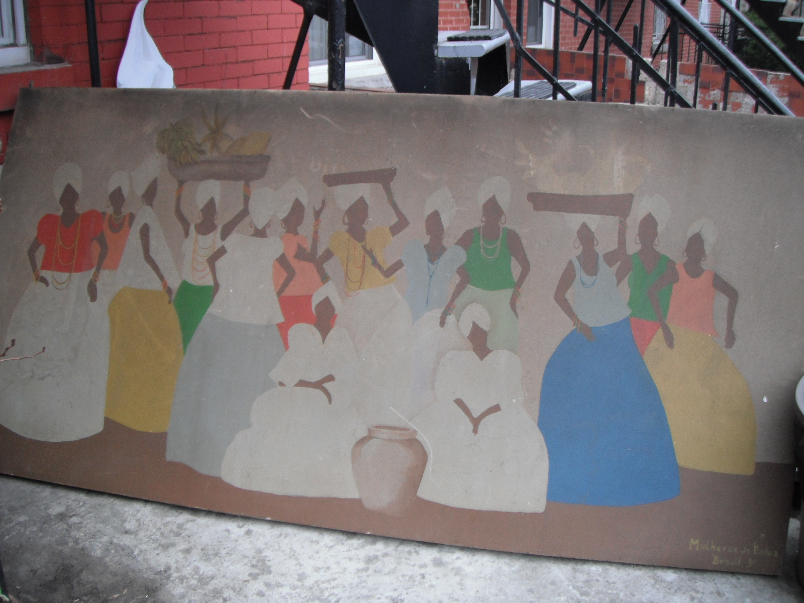 Here’s the last piece for now, that piece of art I mentioned before. This thing in friggin’ huge, and I’m sure some people were amused watching me lug this thing home. It measures in at a whopping 96 x 48 inches. That’s like 8 feet by 4 feet. The caption says something like “women of Brazil.” I was pretty dusty, but I was pretty sure I could clean it off pretty good. On the way back, a kid asked me if I painted it. I said no. He said it was pretty dirty, and thought it was “impossible” to clean.