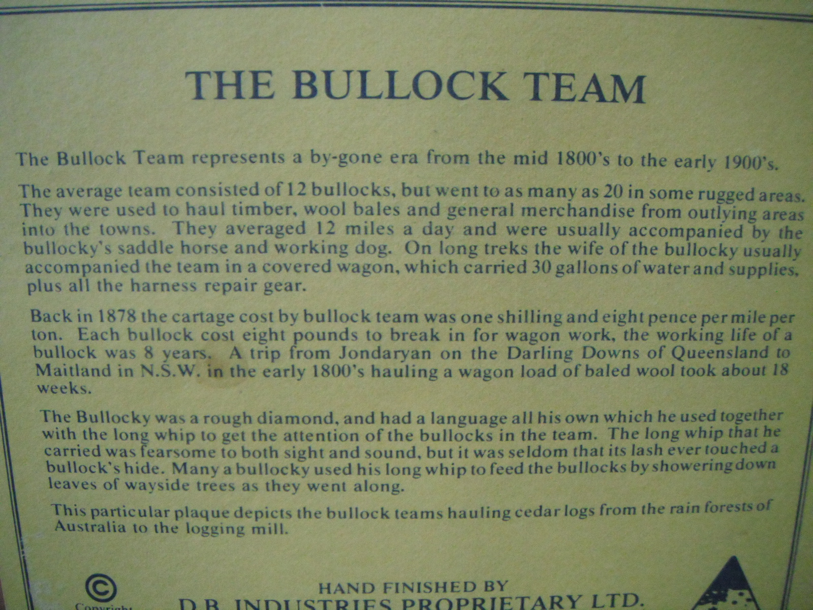 This morning I got up (relatively) early to do some moving work. On the curb in front of the place I was working was a desk, with this piece sitting on the top. It looks like it’s hand-painted on top of a styrofoam mold. On the back is this little history lesson about Bullock (ox) use in Australia (picture below). I get the impression it’s a souvenir from a trip to Australia in the 70s. I ended up carrying this back from Sherbrooke/Atwater to home, a good hour and a bit.