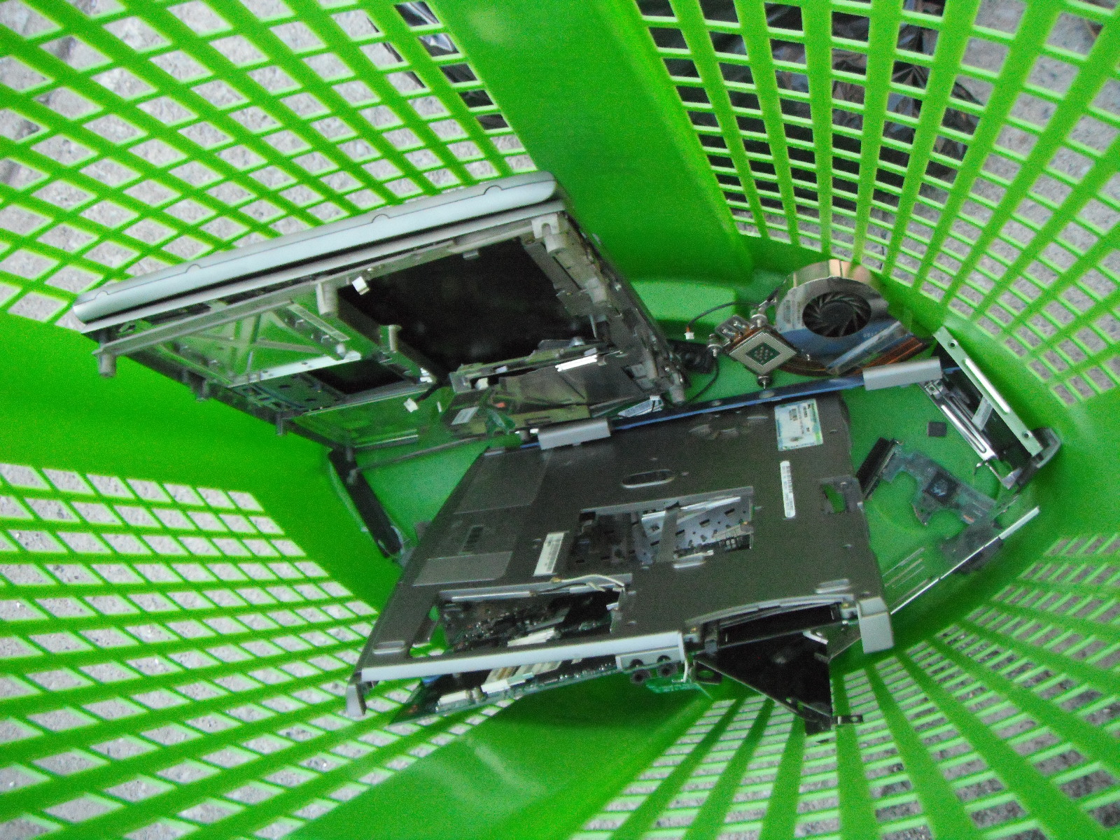 A busted-ass laptop in a laundry container.
