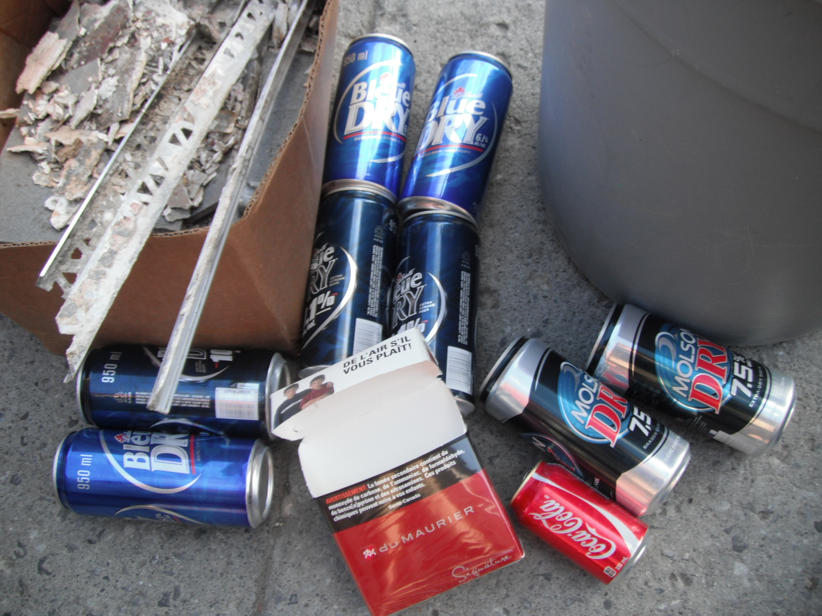 I don’t return cans I find that often, but this was too easy. I found 24 20c cans and 2 5c cans, and returned them for 4.90$. This guy had a very diverse taste in beer, ranging from Blue Dry 6.1 all the way to Blue Dry 10.1. A couple of Molson Dry 7.5 too. There was also like 7 empty forties of Jack, and an empty gigantic cigarette pack. I’ve never seen that size before.