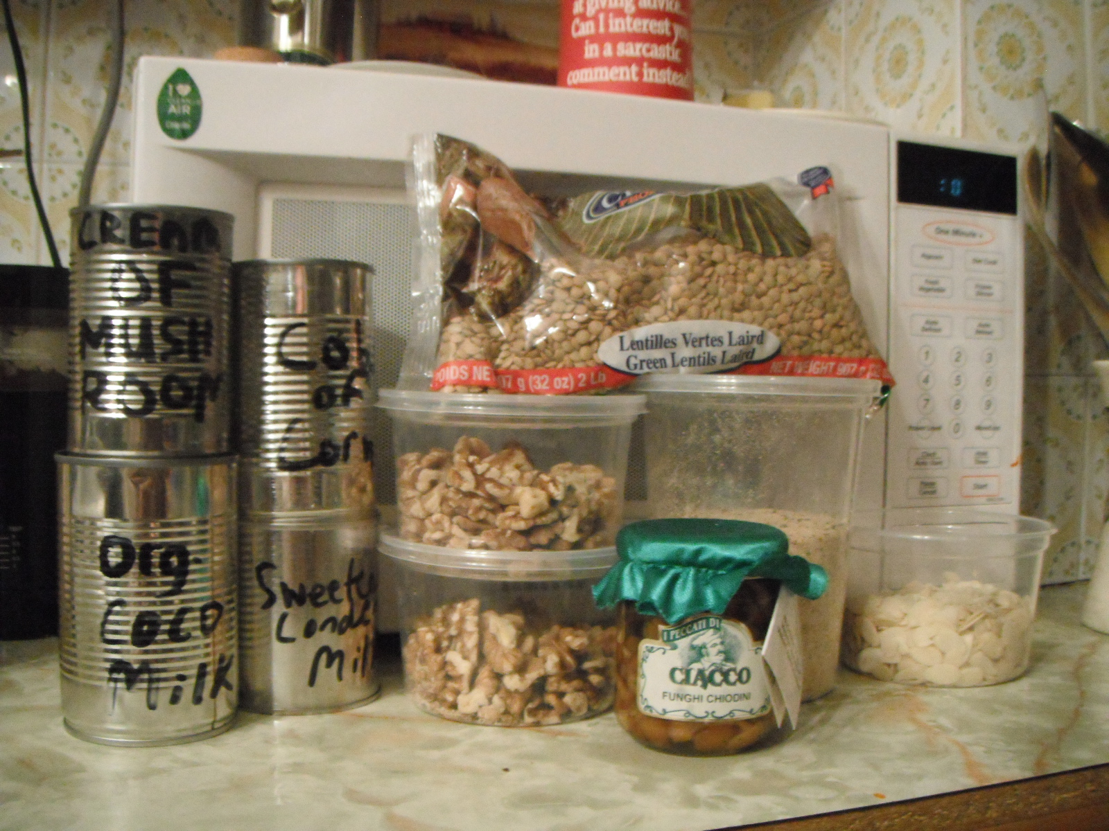 I found a bunch of food in residential garbage bags. I found all this in two different places, but in both cases there was other food waste in the bag too, so I spent a bit of time cleaning it off and repackaging it. There’s some walnuts, almonds, bread crumbs, and some other canned goodness.