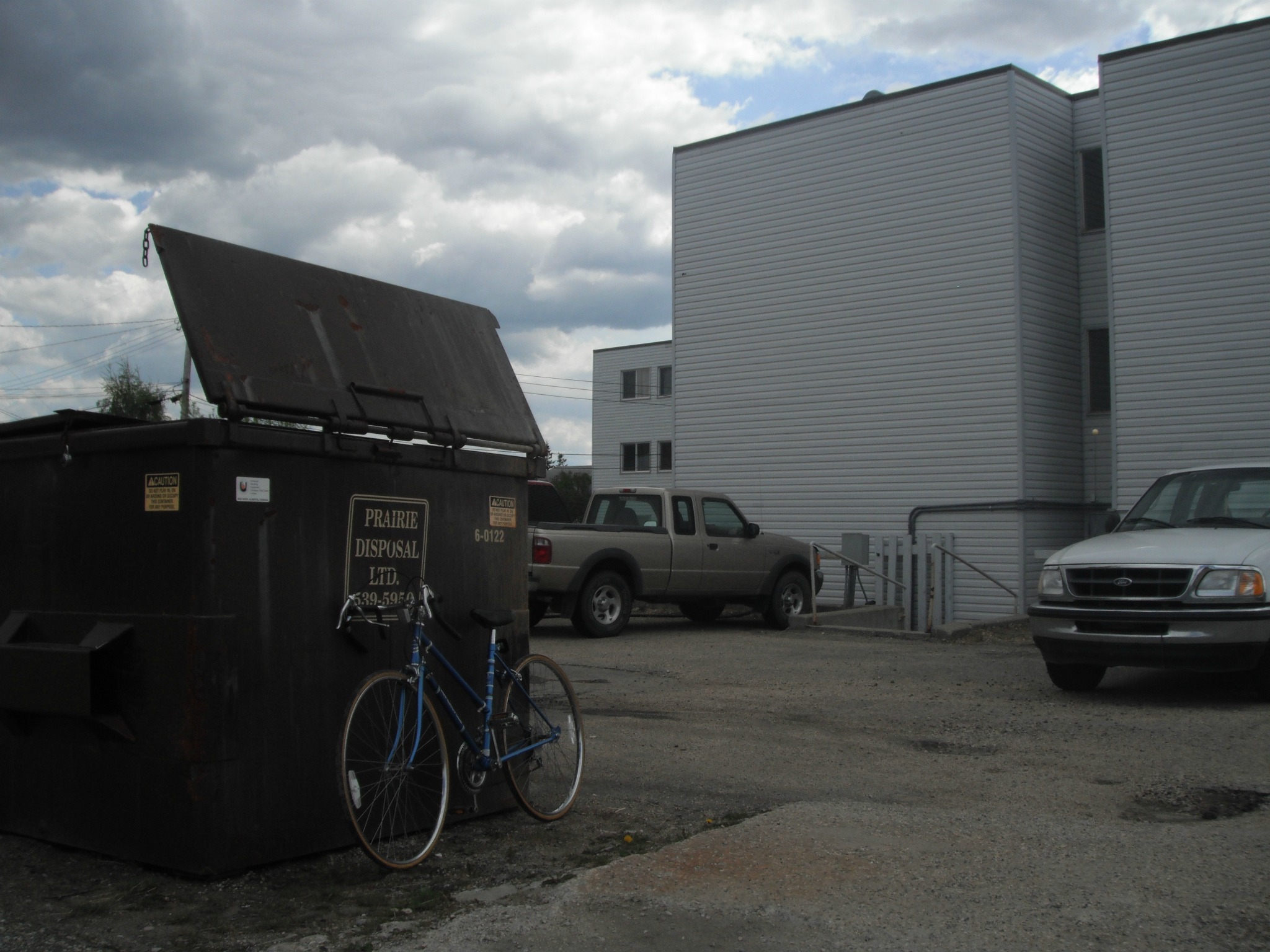 There isn’t much in the way of garbage out here in the Wild West. I’m in Grande Prairie, one of the fastest growing oil towns out here. It’s grown more than double it’s size (from around 26k to 55k) since 1986, and that’s coming from only 8k in 1961 and only being settled by pioneers starting in 1911. As a result, it’s pretty sprawled out, not particularly old, and mostly serviced by big box stores. That isn’t a recipe for great, interesting garbage. The trash bins and dumpsters (as opposed to bags left on the curb) don’t help a garbage picker out much either.