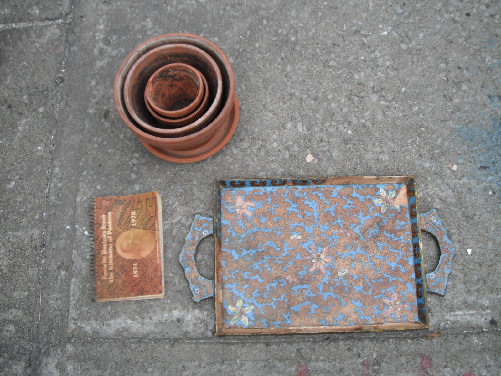 I found all this on Esplanade near St Joseph. A bunch of decent clay pots (which I stashed in an alley for later or for others), an old cookbook (I deemed it worthy of taking based on one of the recipes being a vegetarian lentil salad), and a really cool, if beat up old tray.