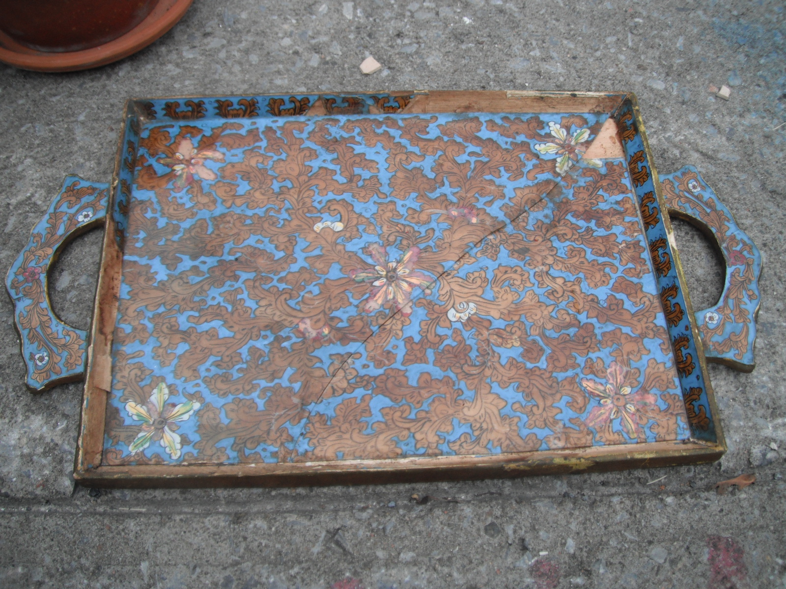 Here’s a close up of the tray. It’s really quite beautiful, and it’s too bad it’s in such poor shape. The glass in the middle is cracked in two, but that’s not as bad as the glass that’s missing altogether. I had to take it, though. It’s still quite lovely and I’m pondering ways that I can creatively restore it, if not to it’s former glory than to some Frankenstein-y modern glory.