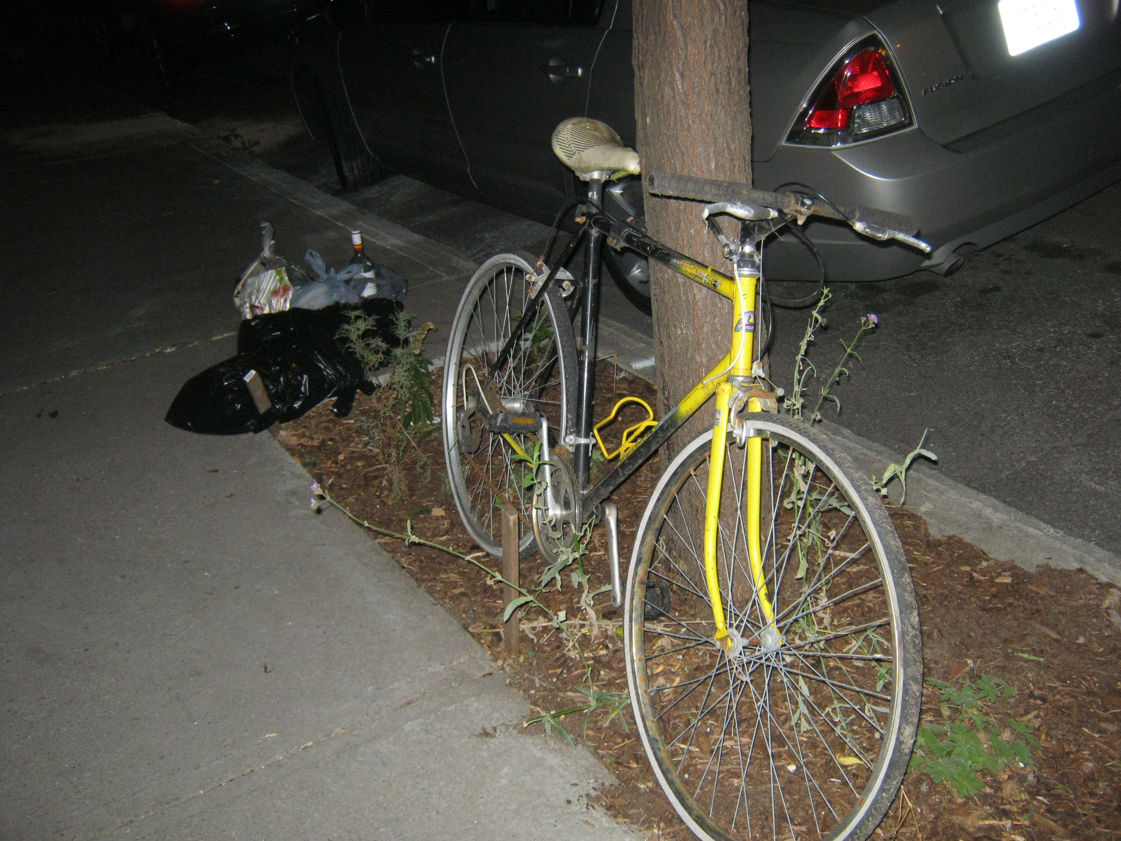 I found this bike unlocked next to some trash bags and wondered if it was garbage or not. Upon closer observation, the tires were both flat (and ancient) at the very least. It was dark so I couldn’t see, but I brought it back with me for a better look tomorrow.