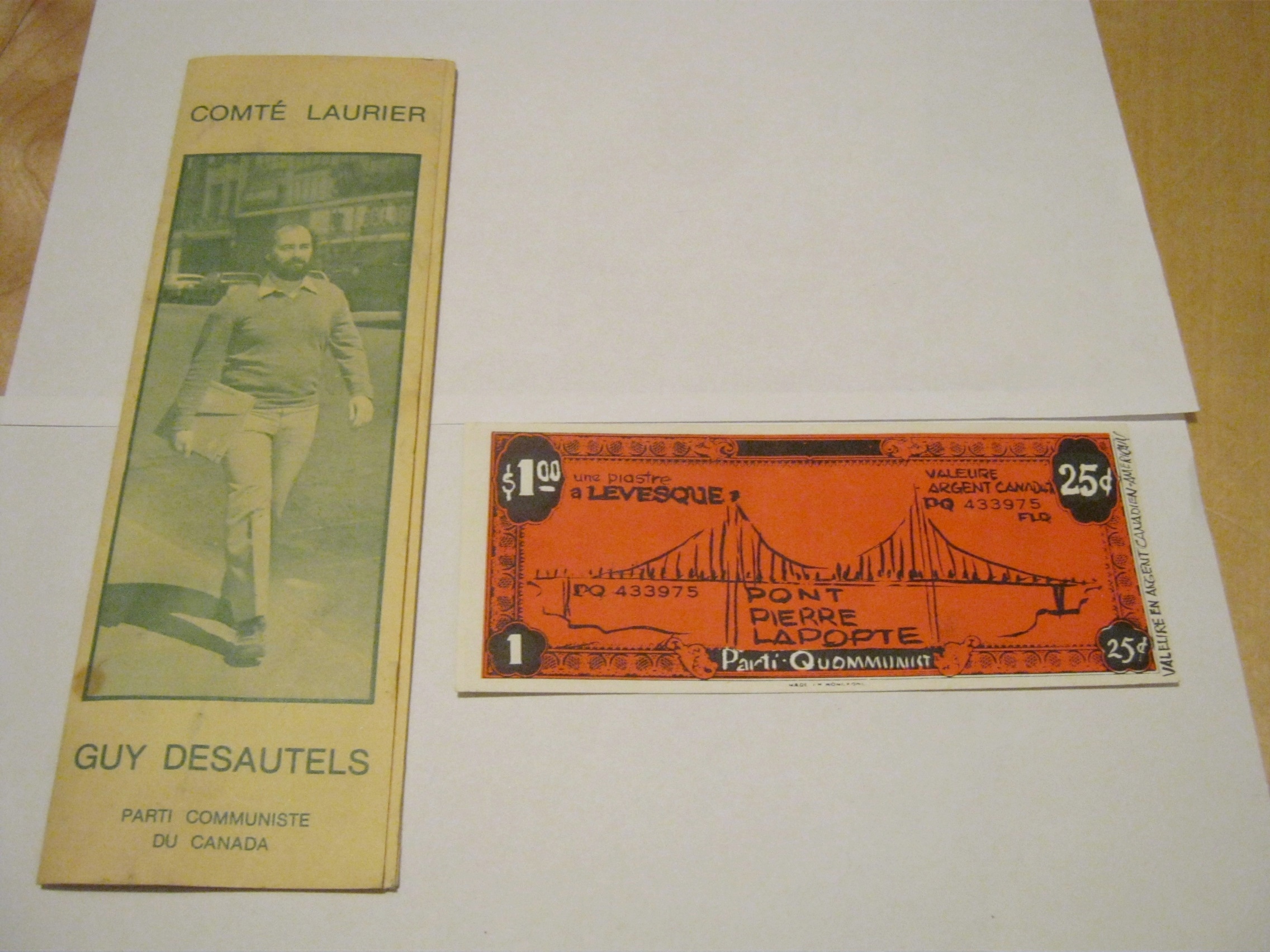 A bit of Quebec Communist Party paraphernalia. Interesting that on the fake money communist is spelled “Quommunist,” which I wonder could be a combination of Quebec and Communist, since the French don’t spell it any different than us.