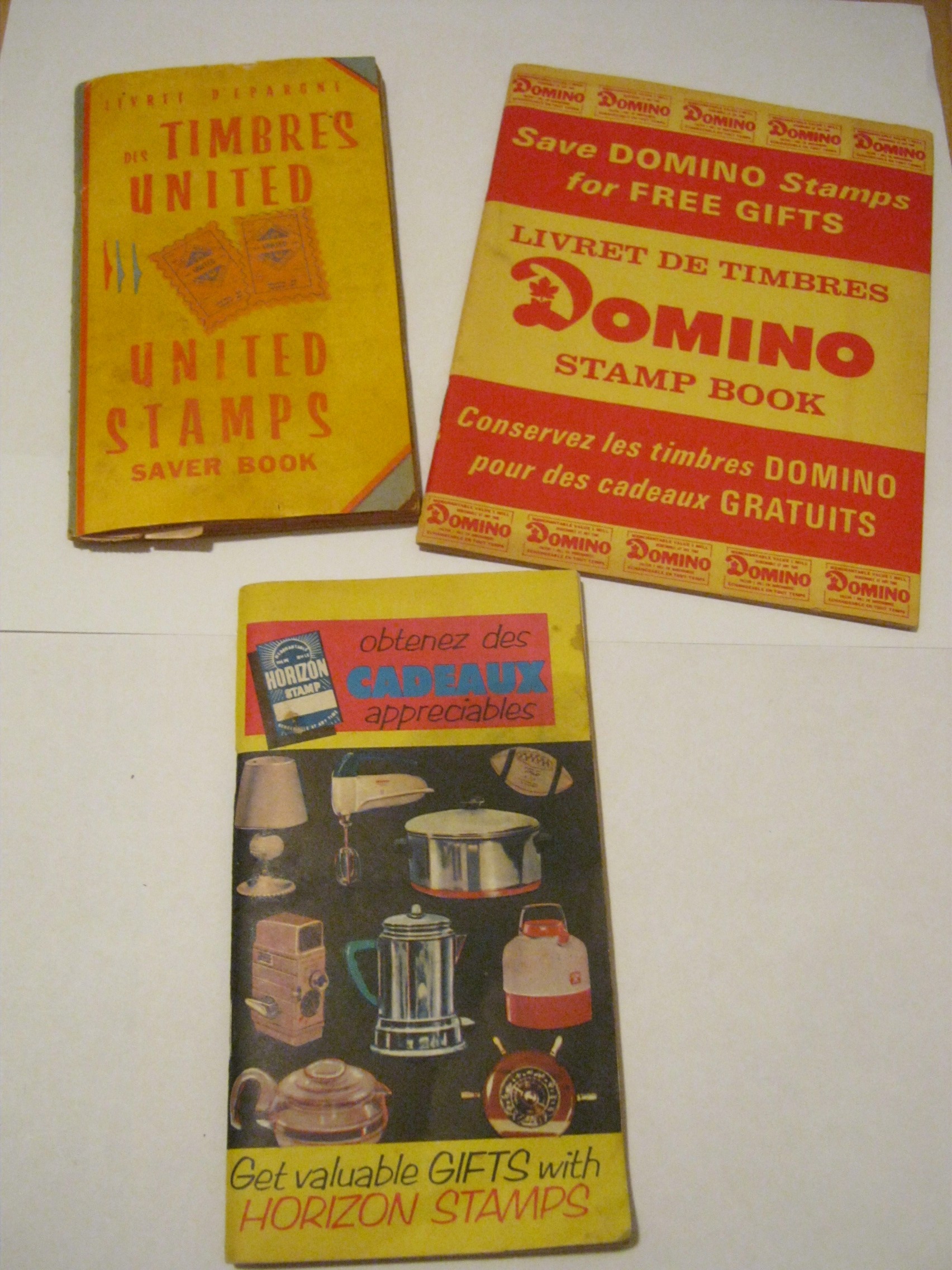 A few old stamp books. I imagine these are an earlier version of those points you get for buying Coke products (or whatever). In this case, you get stamps (presumably when you buy a product) and put them in this book to get free stuff in the future. That was likely a pretty innovative marketing practice at the time.