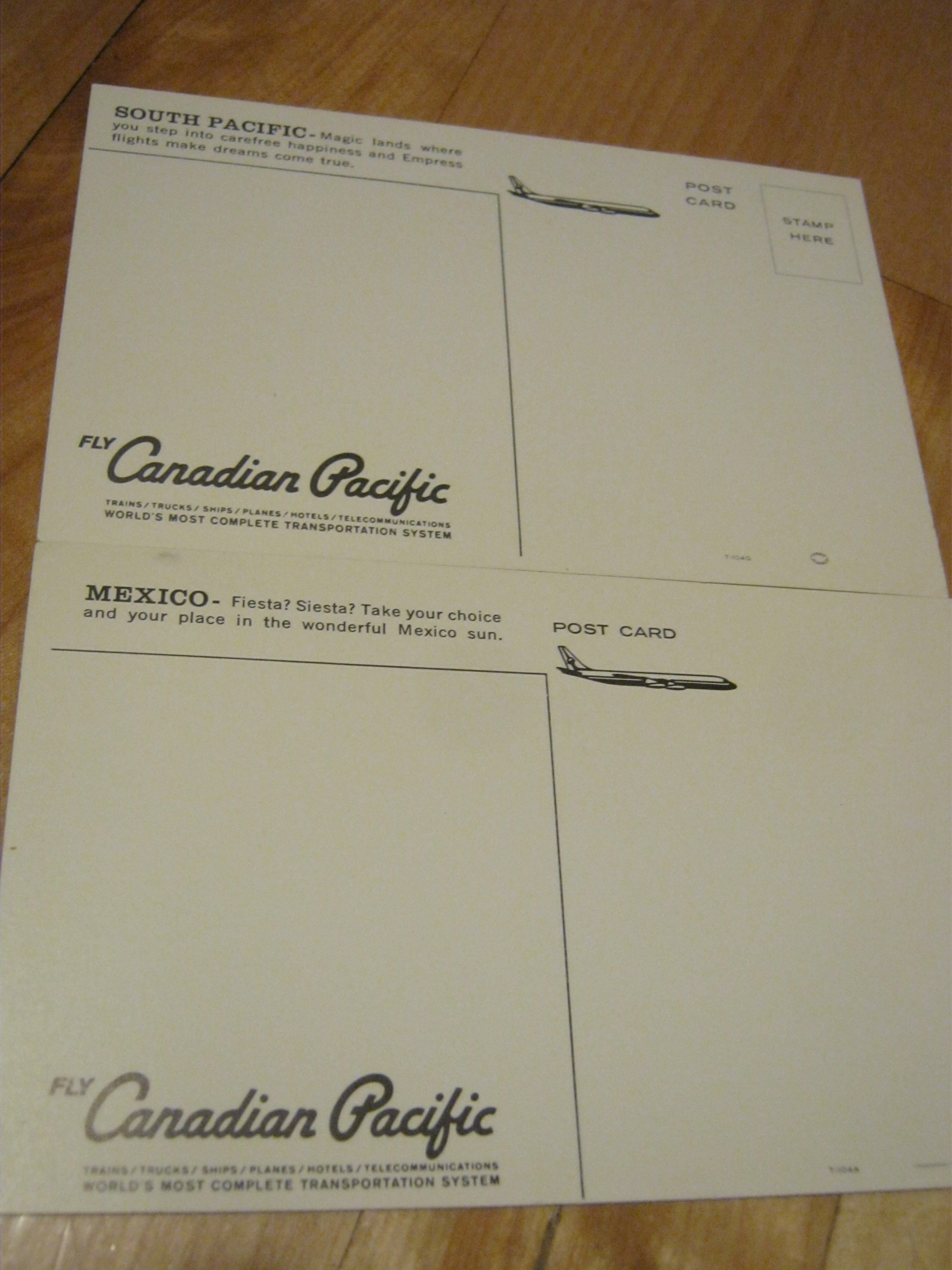 A couple of postcards, probably from the 60s, featuring very idealistic portrayals of the native peoples. Very interesting to look at though. The back has a blurb trying to sell the land to potential travellers: “Mexico – Fiesta? Siesta? Take your choice in the wonderful Mexican sun;” and “South Pacific: Magic Lands where you step into carefree happiness and Empress flights make dreams come true.”