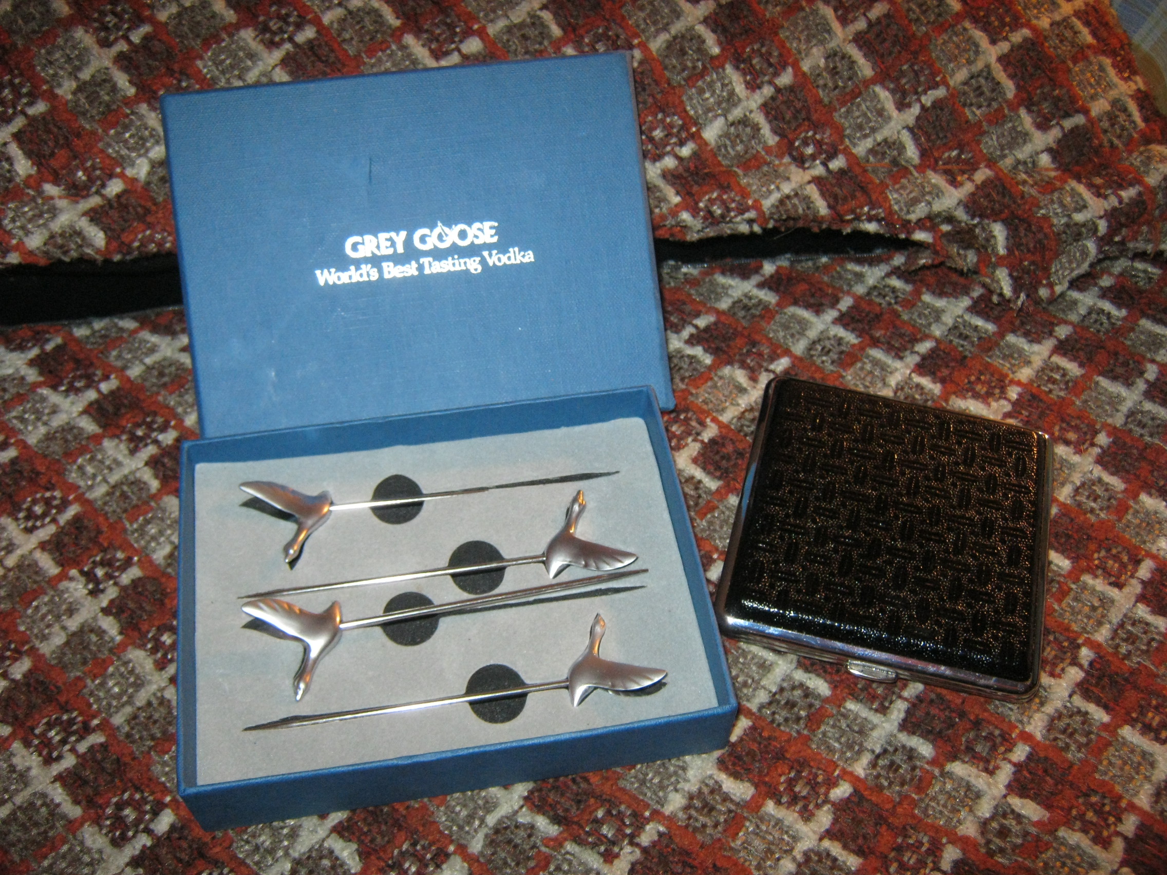 A like-new pack of “Grey Goose” skewers (for cocktails) and a cigarette case.