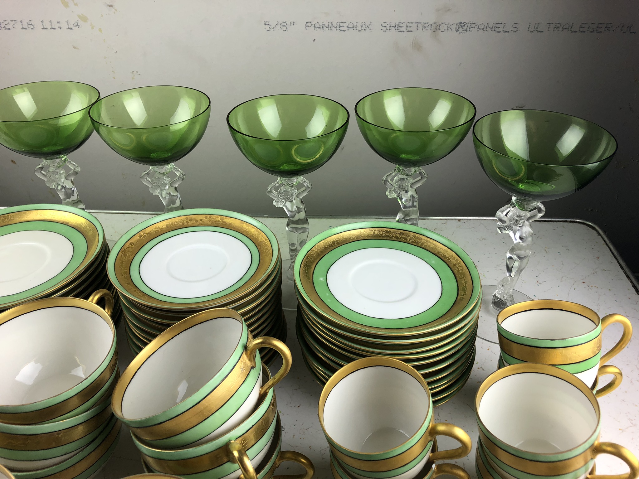 Here’s what was in the box, minus three glasses and a few bits that broke along the way. The biggest set, which features teacups, demitasses, and two handled consomme bowls were made in Limoges by someone with the initials RH (the stamp looks similar to the one on this set).