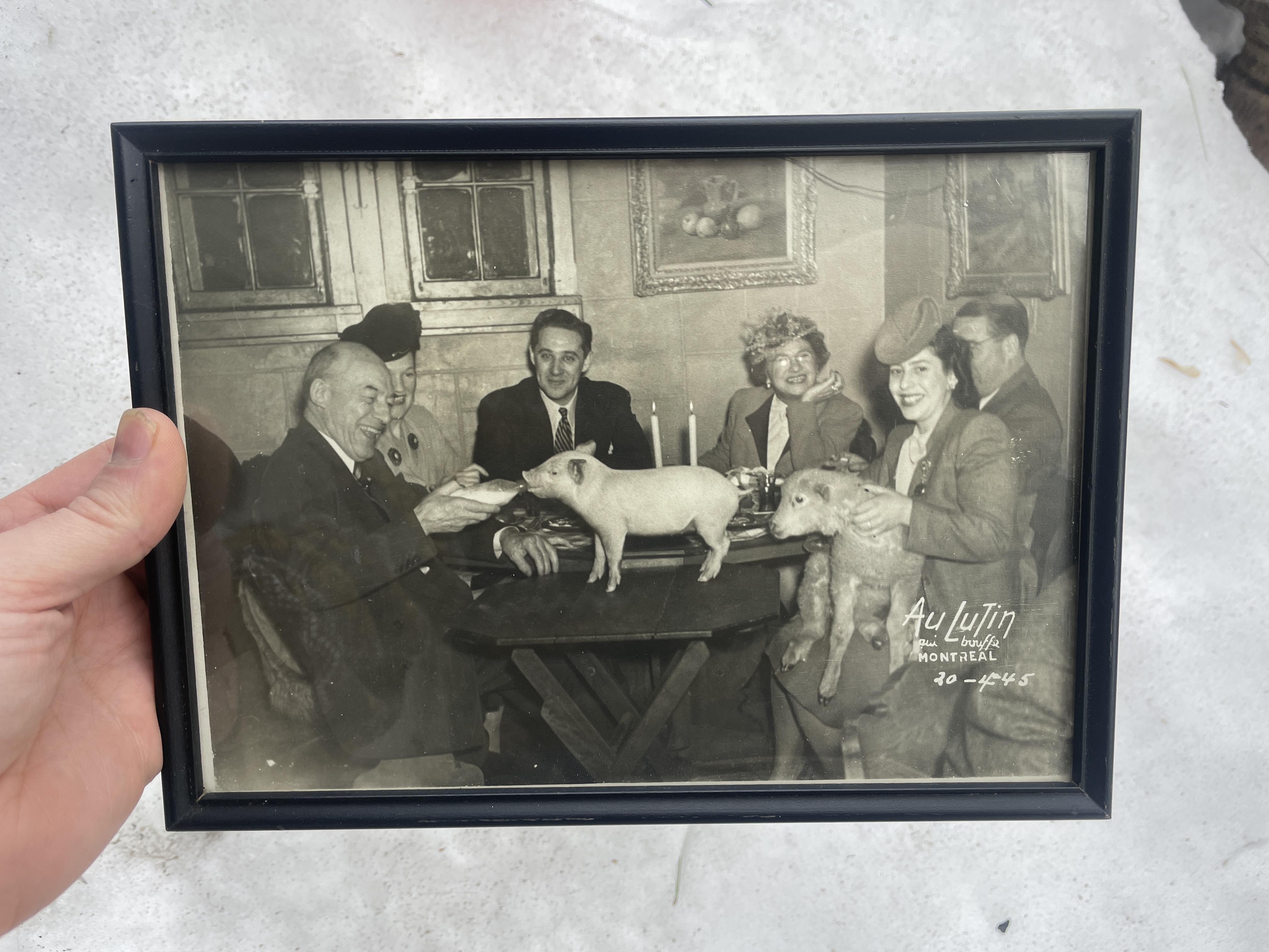 I also found a whole bunch of photos. I’ll share only the most exceptional one, which is this fun photo from the “Au Lutin Qui Bouffe” restaurant which operated on the corner of St-Hubert and St-Gregoire until it burned down in the 70s. They had a schtick where they’d bring a pig to your table for a photoshoot, and a professional photographer would take a picture. I’ve found a few of these photos before (and a menu, which I forgot about until I saw the picture in the article I linked to!), but this is the first one I found framed. Also, I’ve only ever seen these with the pig, but this one has a pig AND a goat. I think I’ll be keeping this one for my personal collection.